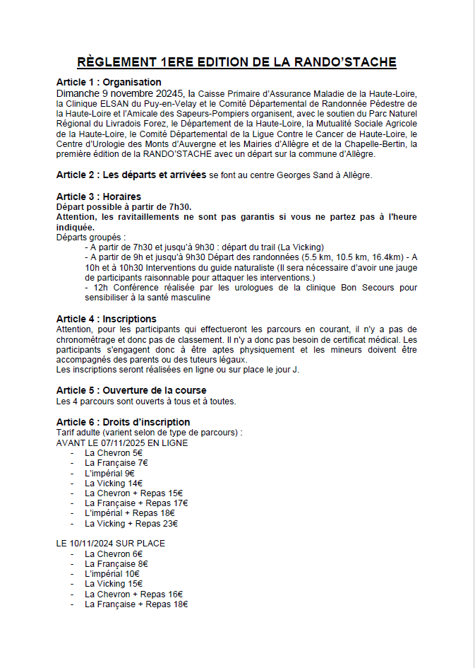 La Rando’Stache est organisée par le service prévention de la Caisse Primaire d’Assurance Maladie de la Haute-Loire, la Clinique ELSAN du Puy-en-Velay et le Comité Départemental de Randonnée Pédestre de la Haute-Loire. Plusieurs partenaires sont associés à cette journée inédite à savoir l’Amicale des Sapeurs Pompiers d’Allègre, le Parc Naturel Régional du Livradois Forez, le Département de la Haute-Loire, la Mutualité Sociale Agricole de la Haute-Loire, le Comité Départemental de la Ligue Contre le Cancer de Haute-Loire, le Centre d’Urologie des Monts d’Auvergne et les Mairies d’Allègre et de la Chapelle-Bertin.